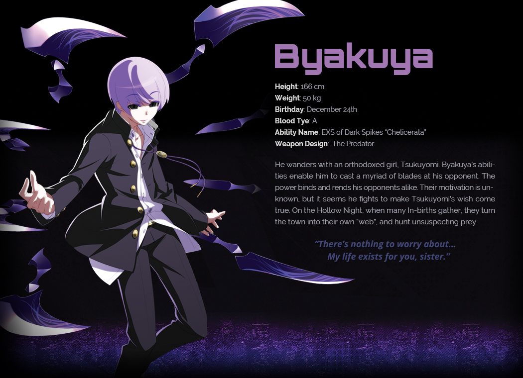 He wanders with an unorthodox girl, Tsukuyomi. Byakuya's abilities enable him to cast out a myriad of blades. The power binds and rends his opponents alike. Their motivation is unknown, but it seems he fights to make Tsukuyomi's wish come true. On the Hollow Night, when many In-Births gather, they turn the town into their own "web", and hunt unsuspecting prey.[2]