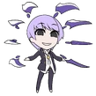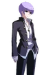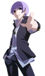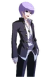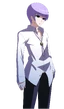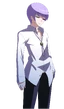 Byakuya is a rather short young man with pale, violet hair and empty, grey eyes. His attire consists of a black, unbuttoned blazer with gold colored buttons on the front of the blazer and on the bottom of his sleeves and he wears a white, long sleeved polo shirt underneath that with the top and bottom buttons undone. He wears a bolo tie around his neck with a purple cord and a golden clasp featuring a pattern that looks similar to that of a large spider. His legwear consists of plain black pants and white derby shoes with gold coloured laces and a gold streak across the front.