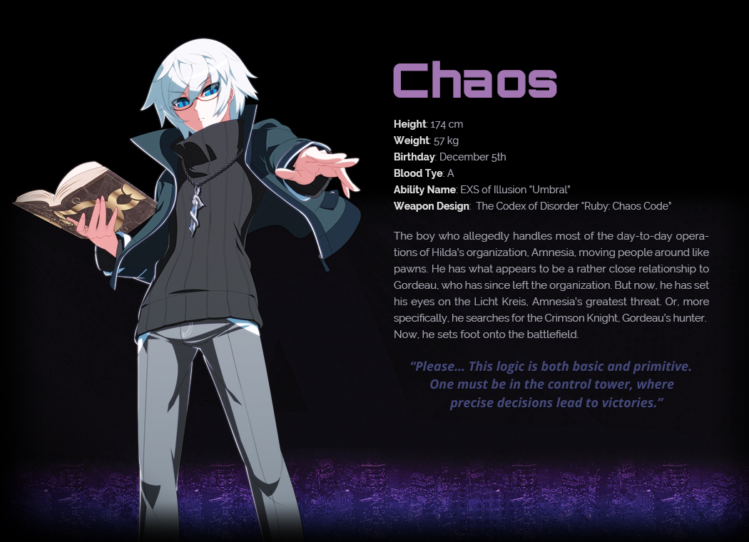 The boy who allegedly handles most of the day-to-day operations of Hilda's organization, Amnesia, moving people around like pawns. He has what appears to be a close relationship to Gordeau, who has since left the organization. But now, he has set his eyes on the Licht Kreis, Amnesia's greatest threat. Or, more specifically, he searches for the Crimson Knight, Gordeau's hunter. Now, he sets foot onto the battlefield.[1]