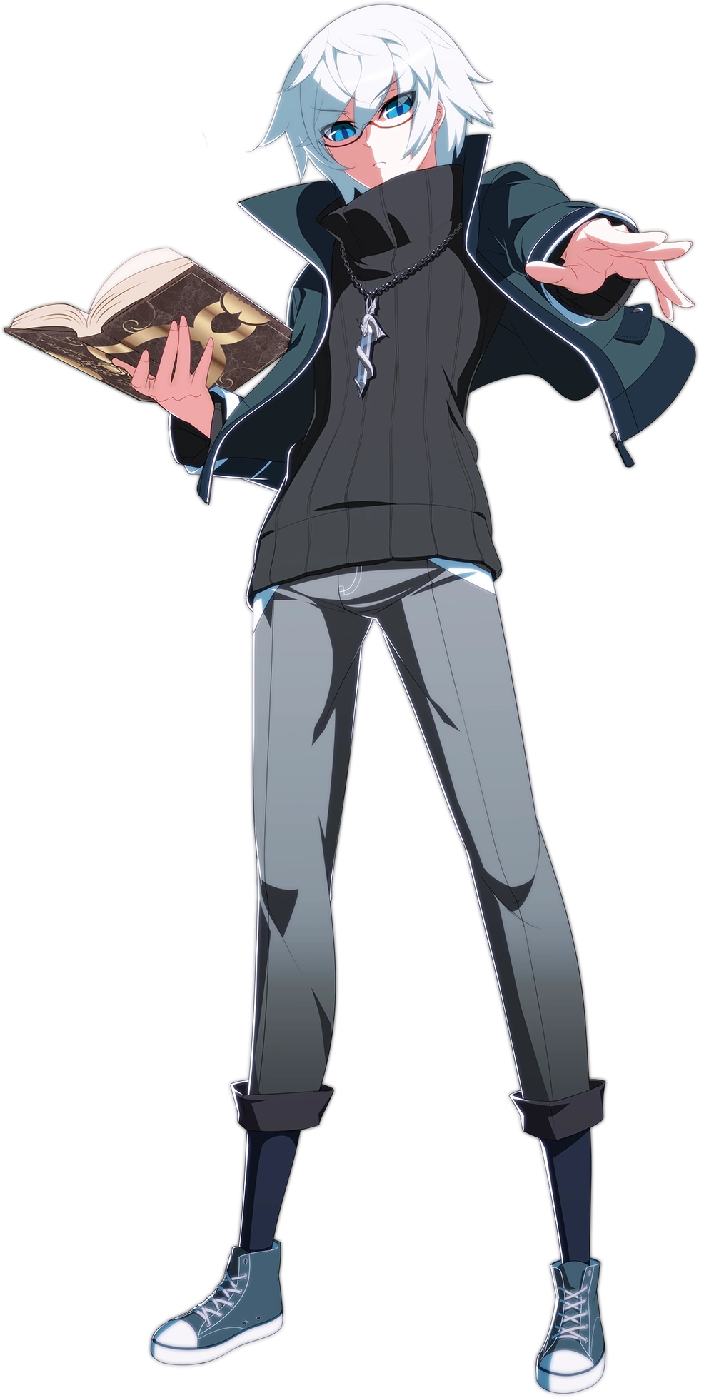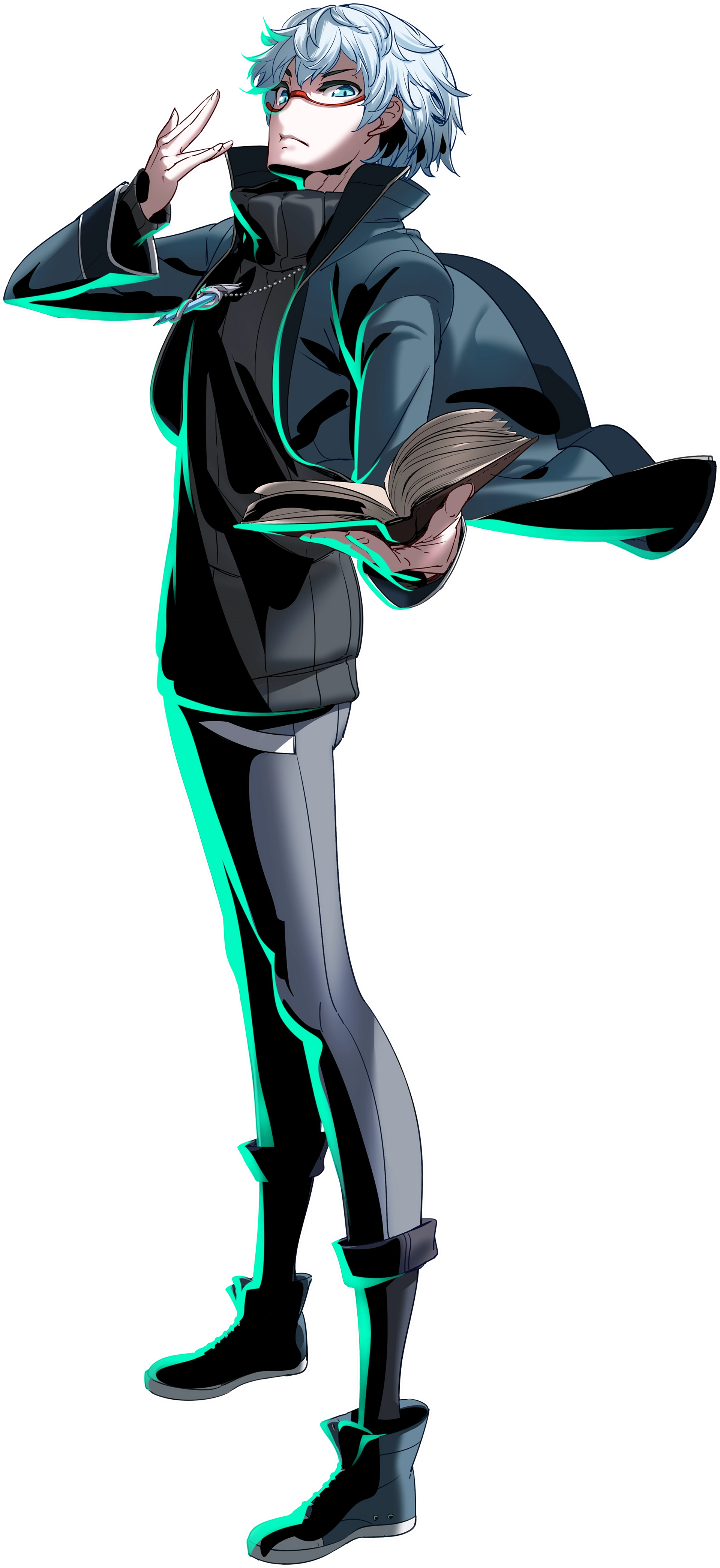 Chaos is a young man with short unkempt white hair and blue eyes, over which he wears red-rimmed glasses. His attire consists of a dark grey turtleneck sweater, an unzipped greyish-blue jacket, light grey slacks with rolled cuffs, navy blue socks, and greyish-blue and white sneakers. He carries with him a brown book with a bronze clasp called the "Chaos Code", and wears a pendant that is a transparent cylinder with a silver serpent coiling around it.