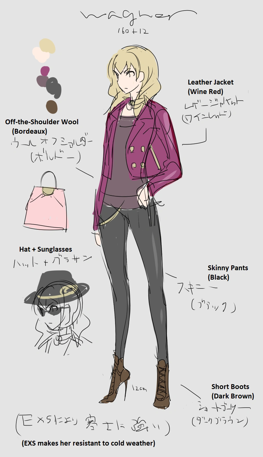 Wagner also has a more formal casual attire consisting of an open, wine colored leather jacket with golden trimmings and buttons and a bordeaux colored off-the-shoulder top underneath, a dark grey choker and a gold necklace and pendant to go along with it, black skinny jeans with a gold chain hanging from it and some brown, ankle-length high heel boots, and a pair of sunglasses and a black fedora with gold patterning to complete the look. Wagner has only been seen wearing this outfit in the official 2018 Valentine's Day illustration.