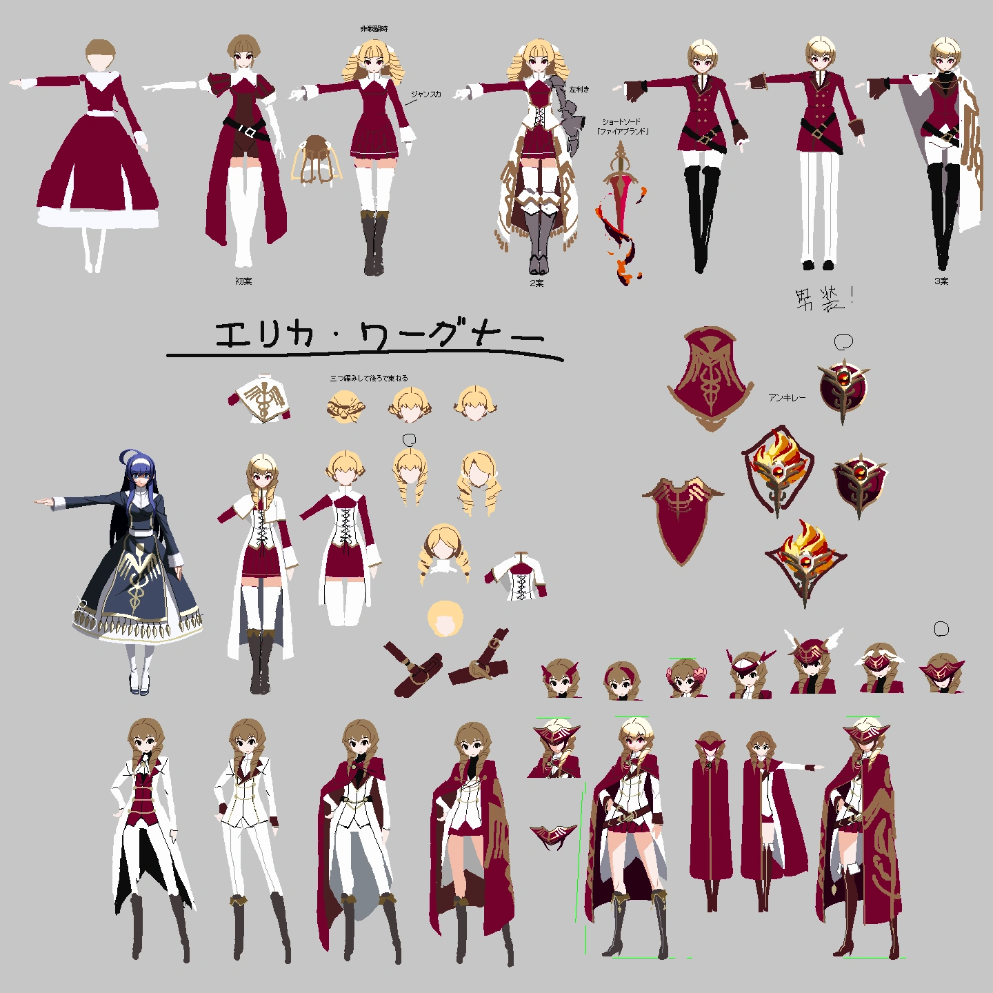 Wagner's school attire consists of a red sailor uniform with dark grey lapels and sleeves with gold trimmings and Licht Kreis insignias adorning the wrists as well as a white cravate with another insignia acting as a clasp. Wagner also wears a dark grey miniskirt with gold trimmings as well as dark grey tights and a white, high-neck shirt.
